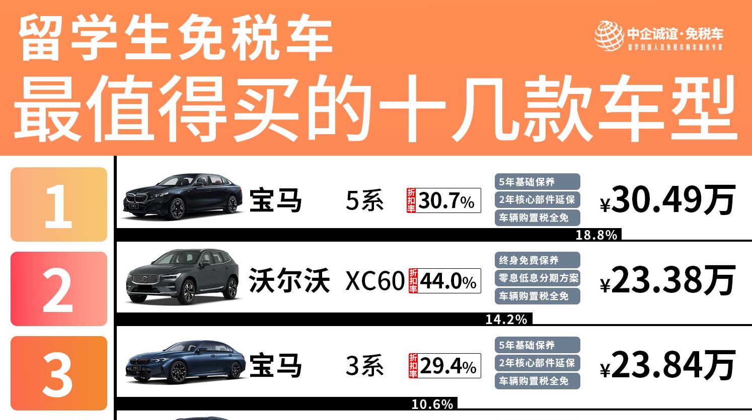 中企诚谊给大家盘点了2025留学生免税车选购最多的车型——宝马/沃尔沃/奥迪/奔驰/大众/林肯等诸多品牌全涵盖