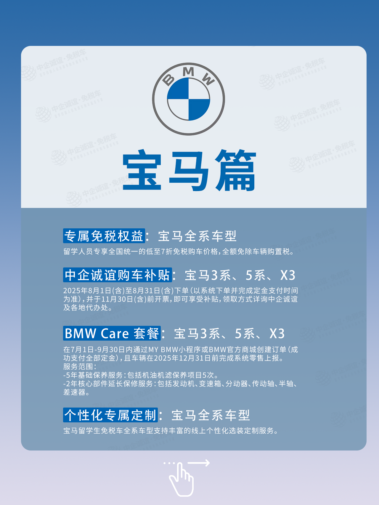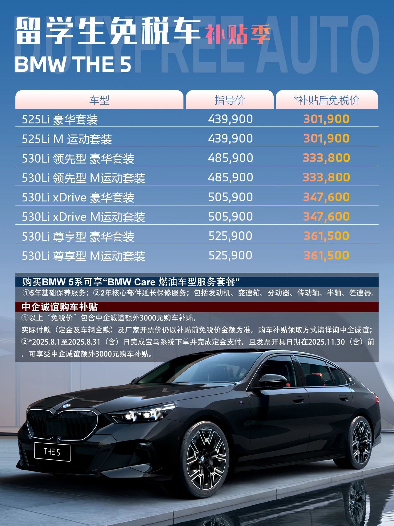 此前7月,中企诚谊针对宝马3系、5系、X3推出的3000元额外购车补贴,掀起了留学生购车热潮🔥——当然,宝马的免税价本就比市场指导价低出一大截,再叠加5年保养、2年延保的BMW Care套餐,又有中企诚谊额外补贴,性价比直接拉爆!