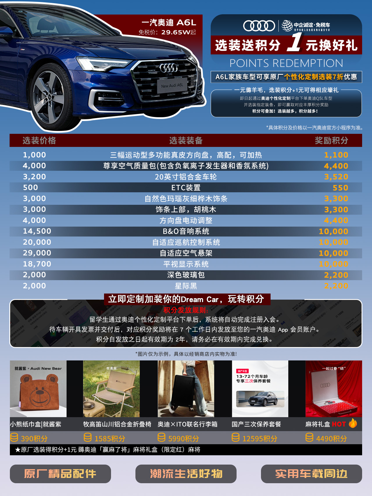 2️⃣更惊喜的是,补贴范围这次扩大至【一汽奥迪Q5L和A6L车型】,一汽奥迪免税车目前可叠加3次原厂免费机油,同时个性化定制配置至高6.5折优惠还能得丰厚积分换取海量好礼!
