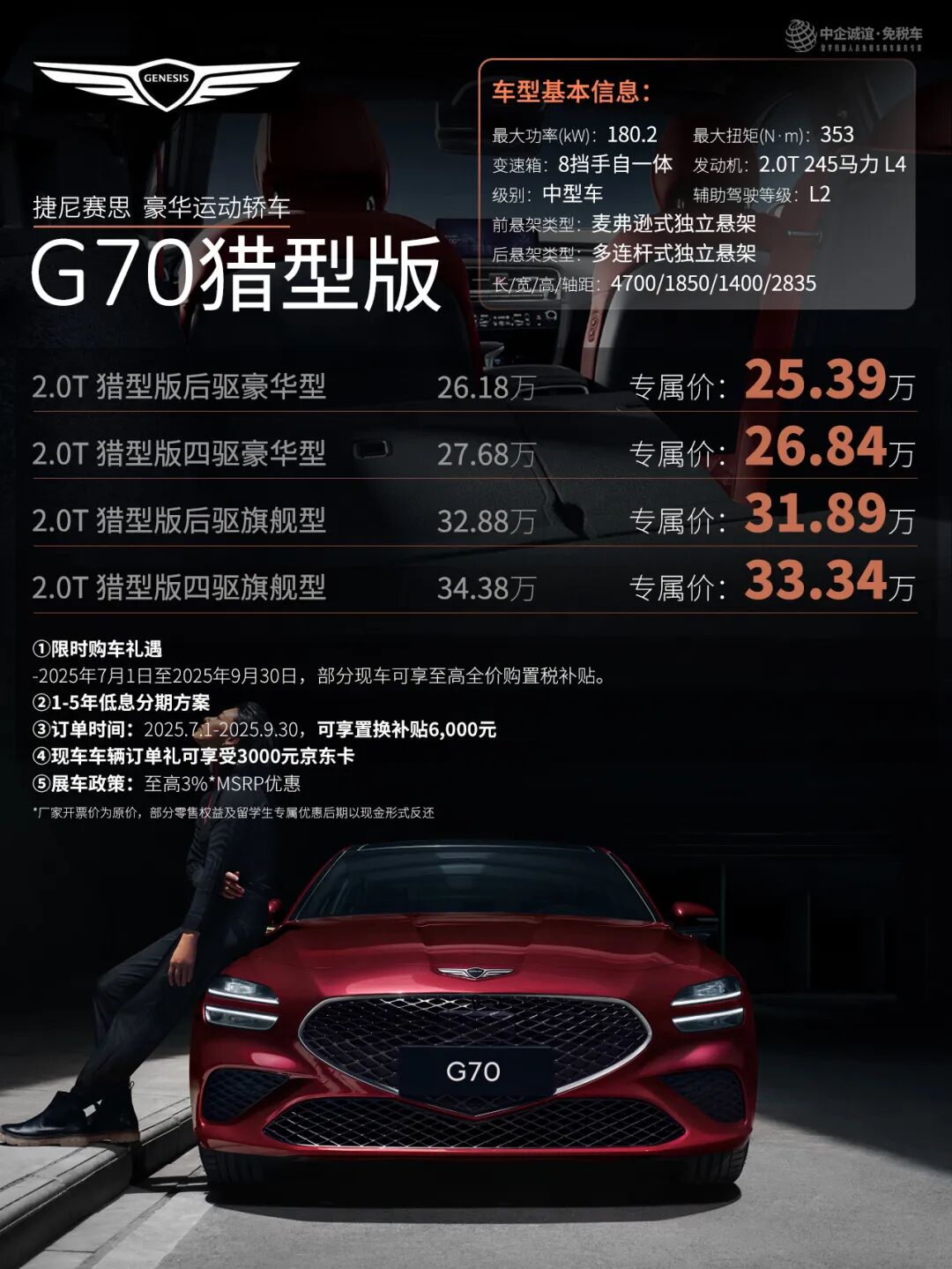 ■G70猎型版造型融合轿跑流畅线条与旅行车实用性,“勇者之徽”钻石格栅与分体式LED大灯极具辨识度,尾部双线尾灯勾勒出优雅的“游艇式”轮廓。