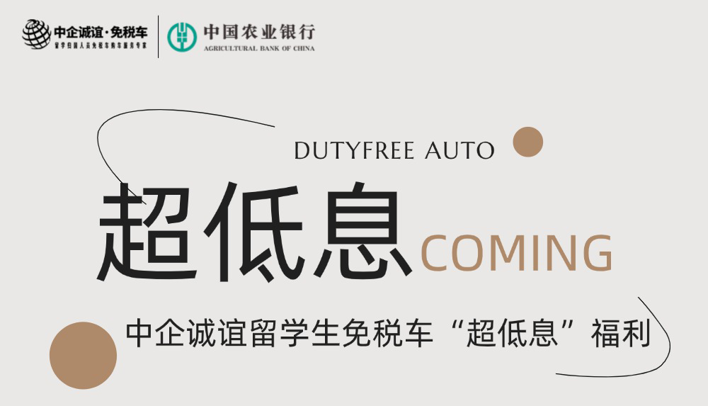 不过,好消息来啦!中企诚谊充分考量到同学们的需求与困扰,历经多轮与银行总行沟通,现特别推出留学生免税车1-5年农业银行超低息金融政策,这将有效缓解留学生在购车资金方面的压力,让同学们既能享受免税车的优惠,又无需担忧高额利息,轻松开启回国有车生活,接下来就让我们一同深入了解一下吧。