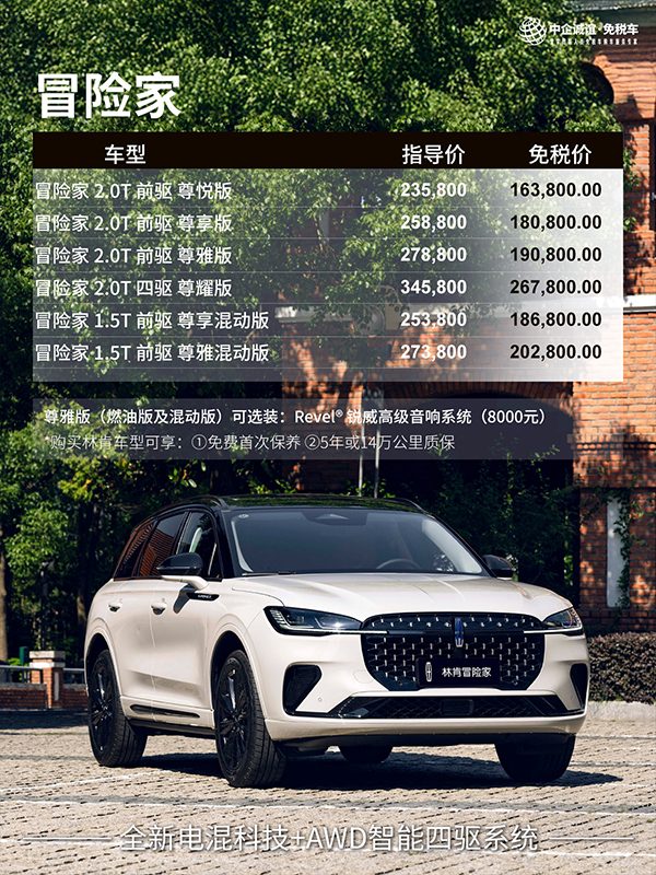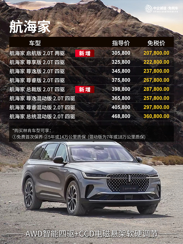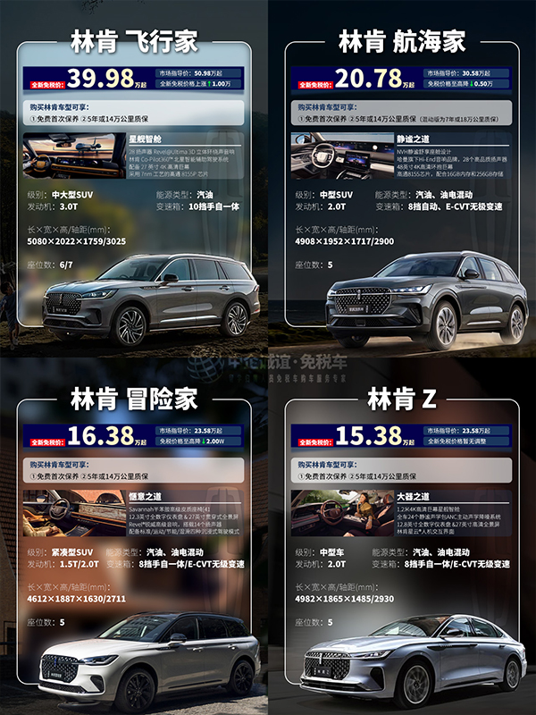 综上,林肯留学生免税车此次调价虽有分化,但整体仍贴合留学生需求。降价的冒险家、航海家进一步降低豪华入门门槛,林肯Z以超低底价保持竞争力,涨价的飞行家则凭高品质匹配其应有的价值。