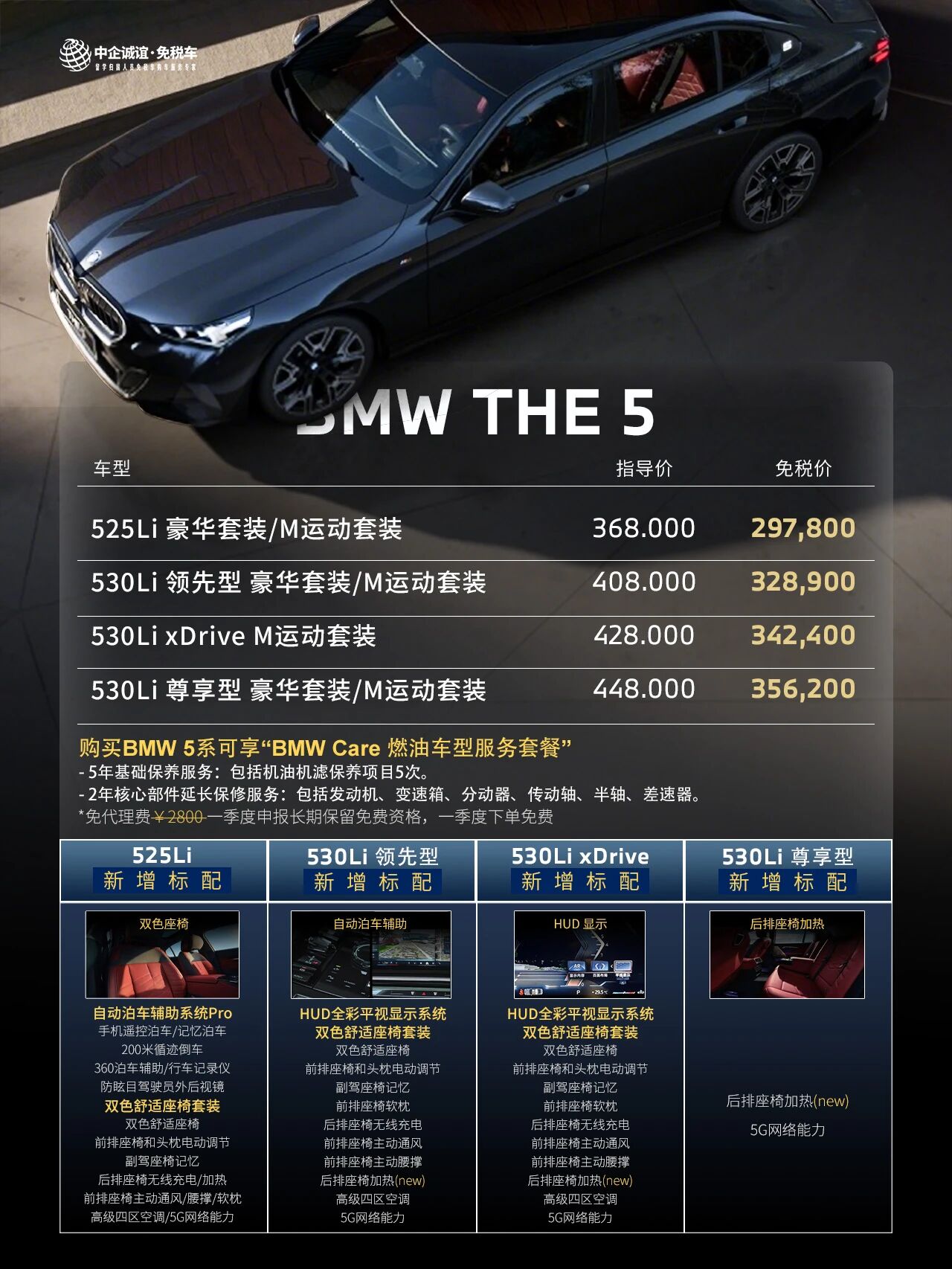 购买BMW 5系长轴距版车型可享受随车赠送的“BMW Care 燃油车型服务套餐”(参考价值9288元)