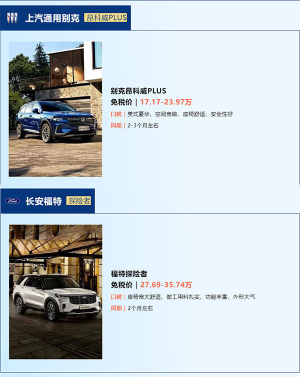 以下推荐车型只列明品牌车系及免税价区间,具体车型及价格可通过文章末尾处的“阅读原文”查看。