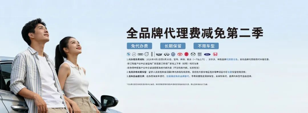 第二季度福利续杯!中企诚谊代办费免/减活动正式延续至2026年6月30日。不仅真金白银的减免活动继续生效,更有免税资格可长期保留、选车自由度放宽同步加持,同时盘点近期几款“省的多”、“品牌硬”、“提车快”的热门车型推荐,更有十余款重磅全新车型即将加入免税车目录,给准备购车的留学生朋友们更丰富的车型选择、更充足的决策时间。